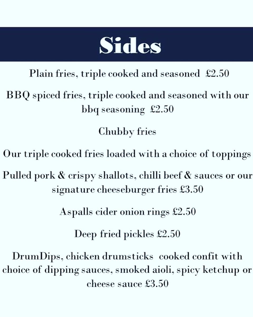 Sides include choices such as BBQ spiced fries, triple cooked and seasoned with BBQ seasoning, Aspalls cider onion rings, and deep-fried pickles, providing a range of complementary accompaniments.
